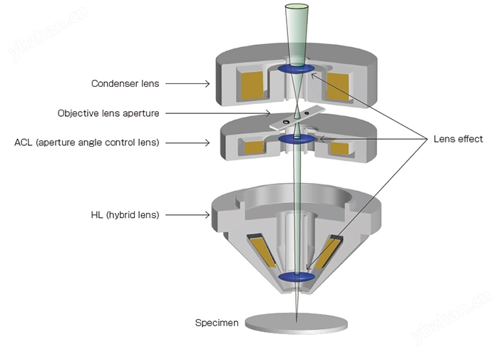 JSM-F100包括一個光闌角孔優化透鏡(ACL)。ACL抑制入射電子的擴散,以始終保持最小的探頭。這是通過對孔徑角度的優化控制來實現的,以適應探頭電流的大變化,使掃描電鏡的操作包括高分辨率成像和x射線分析順利進行。