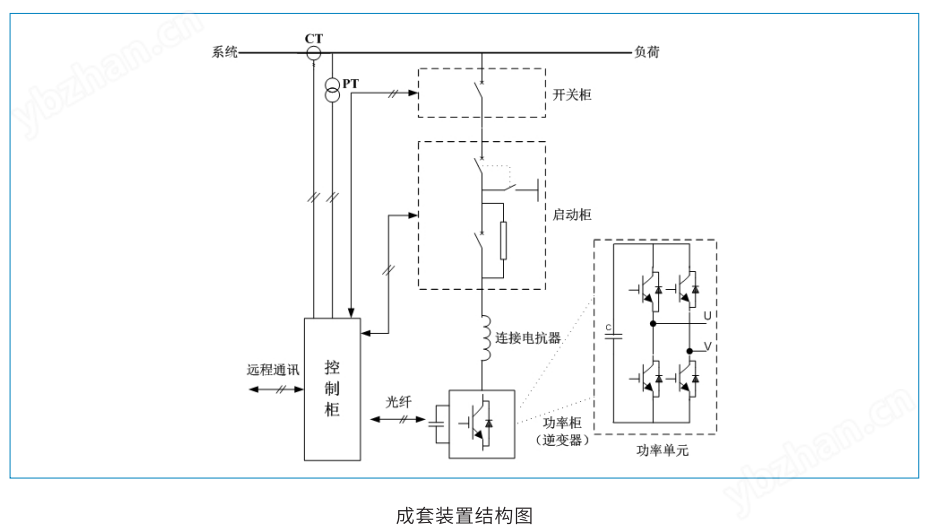 單臺HTSVG裝置結構如下圖所示。裝置由控制柜、功率柜、啟動柜和連接電抗器(或變壓器)組成。