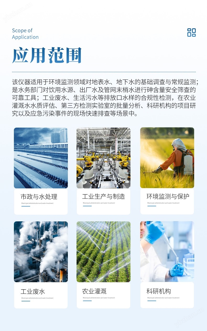 本儀器基于分光光度法原理,專門用于各類水體中總砷的定量檢測,其測量范圍覆蓋0.01mg/L至0.50 mg/L。該儀器適用于環境監測領域對地表水、地下水的基礎調查與常規監測;是水務部門對飲用水源、出廠水及管網末梢水進行砷含量安全篩查的可靠工具;同時可應用于工業廢水、生活污水等排放口水樣的合規性檢測(復雜樣品需經標準消解預處理)。此外,在農業灌溉水水質評估、第三方檢測實驗室的批量分析、科研機構的項目研究以及應急污染事件的現場快速排查等場景中,本儀器均能提供準確、便捷的檢測支持。其方法符合國家標準核心原理,操作簡便,結果穩定,是環保、衛生、水務、工礦企業及科研教育機構進行水質砷分析的理想選擇。