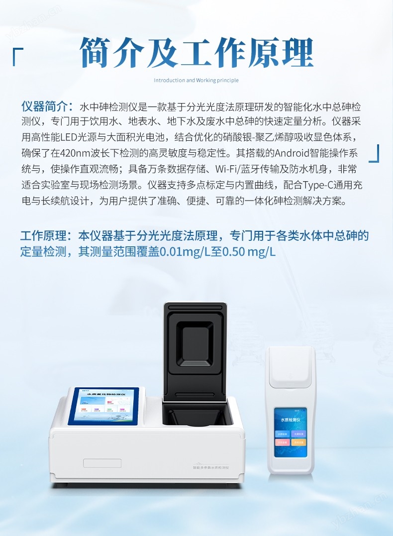 手持式水中砷檢測儀是一款基于分光光度法原理研發的智能化水質總砷檢測儀,專門用于飲用水、地表水、地下水及廢水中總砷的快速定量分析。儀器采用高性能LED光源與大面積光電池,結合優化的硝酸yin-聚乙烯chun吸收顯色體系,確保了在420nm波長下檢測的高靈敏度與穩定性。其搭載的Android智能操作系統,使操作直觀流暢;具備萬條數據存儲、Wi-Fi/藍牙傳輸及防水機身,非常適合實驗室與現場檢測場景。儀器支持多點標定與內置曲線,配合Type-C通用充電與長續航設計,為用戶提供了準確、便捷、可靠的一體化砷檢測解決方案。