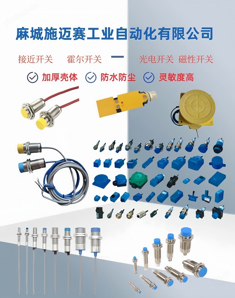 麻城施邁賽工業自動化有限公司主營產品:接近開關、光電開關、兩級跑偏開關、雙向拉繩開關、霍爾開關、氣缸磁性開關、防爆磁性接近開關、打滑開關、井筒開關、防撕裂開關、料位監測器、速度檢測器、欠速開關、堆煤開關、阻旋式料位開關、煤流開關、傾斜開關、速度傳感器、齒輪傳感器、礦用電氣、行程限位開關、皮帶輸送裝置控制柜、礦用聲光報警器、起重機配件、凸輪控制器、主令控制器、聲光組合信號器等自動化工控。