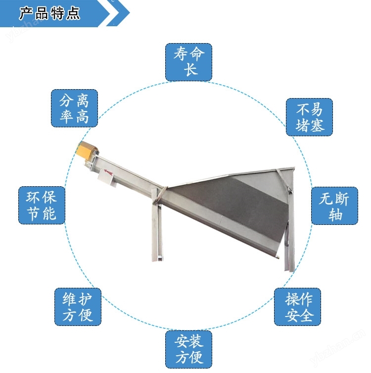 螺旋式砂水分離器安裝傾角在20°—30°之間,砂水混合液從進水管進入水箱,混合液中比重較大的顆粒(如砂粒)由于自重面下降沉積于螺旋槽底部,在螺旋的推動下,物料沿斜置的U型槽底部提升,離開液面后,繼續(xù)上移一段距離,砂粒中的水份逐漸在螺旋槽中的間隙中流回水箱,砂粒也逐漸干化在出料口處,依靠自重落入其它輸送裝置。上清液則不斷的從排水管中流出。達到砂水分離目的。