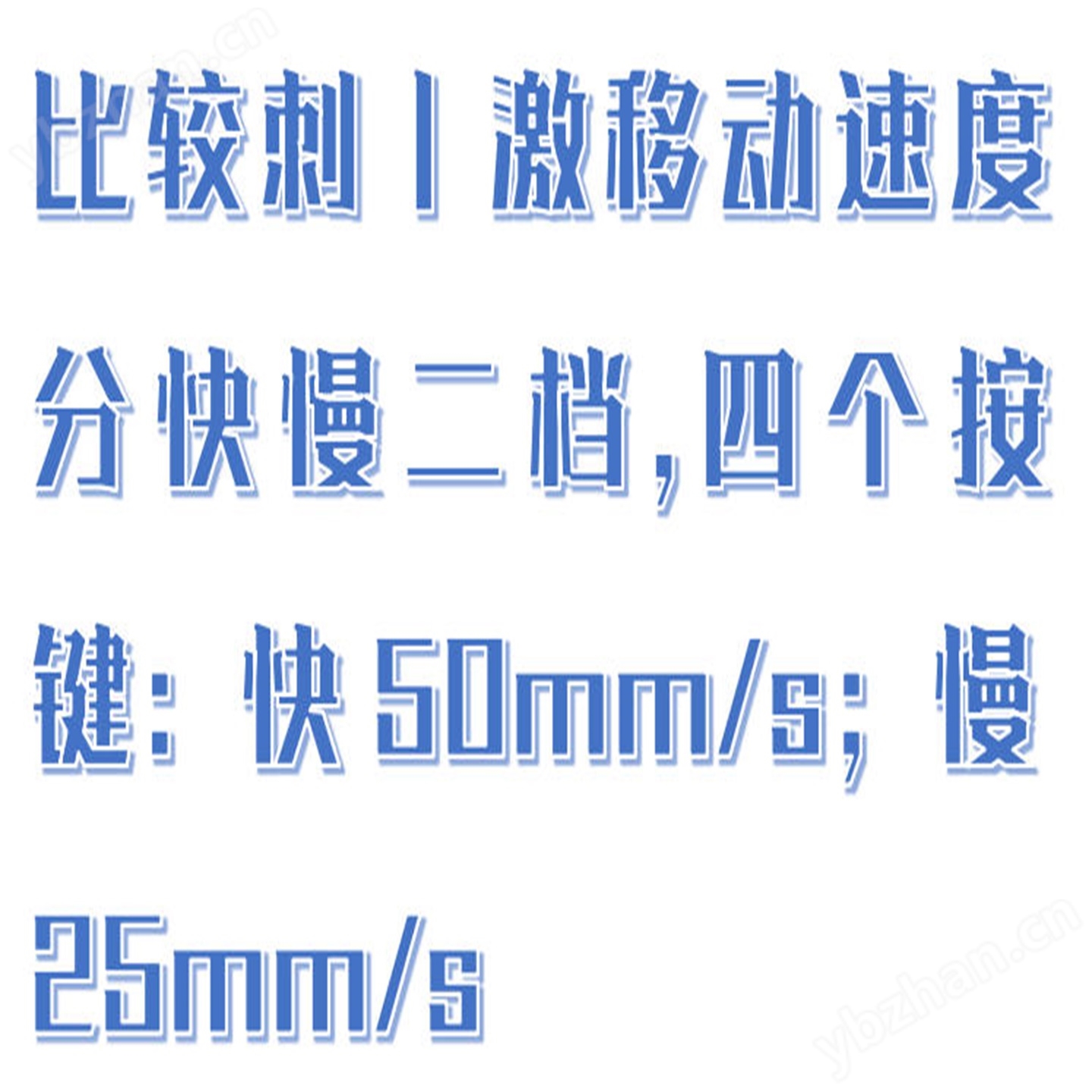 1、比較刺丨激移動速度分快慢二檔,四個按鍵:快50mm/s;慢25mm/s,并標識“快進”、“快退”,“慢進”、“慢退”
