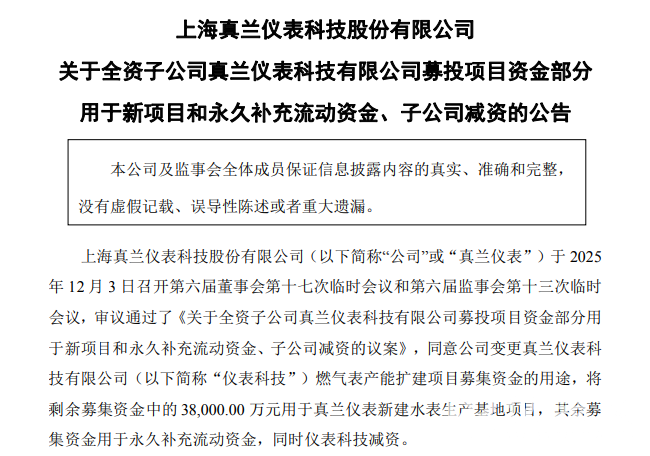 2025年12月3日,真蘭儀表第六屆董事會第十七次會議審議通過了《關于全資子公司真蘭儀表科技有限公司募投項目資金部分用于新項目和永久補充流動資金、子公司減資的議案》。公司擬變更首次公開發行募集資金投資項目——真蘭儀表科技有限公司燃氣表產能擴建項目,將剩余募集資金中的38,000.00萬元用于真蘭儀表新建水表生產基地項目,其余結余募集資金(包括利息和理財收益)全部用于永久補充流動資金,同時儀表科技減資。