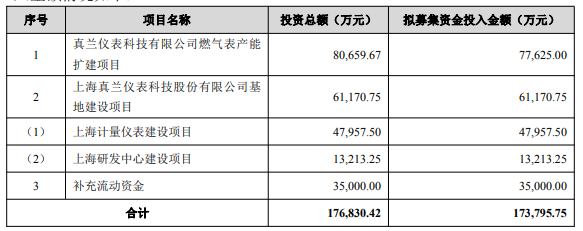 公告顯示,真蘭儀表首次公開發行人民幣普通股股票7,300.00萬股,每股發行價格為人民幣26.80元,募集資金總額為人民幣195,640.00萬元,扣除各項發行費用后,募集資金凈額為人民幣185,776.96萬元。公司募集資金投資項目投資總額及募集資金投入金額情況如下: