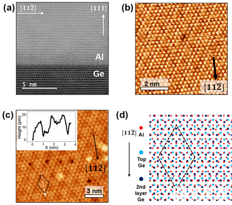 圖1. (a) 鋁/鍺異質結薄膜的原子分辨級截面TEM圖像。(b) 厚度為2nm的鋁薄膜表面的原子分辨級STM圖像。(c) 利用金修飾后的STM探針測量的鋁表面Moiré圖樣。插圖:沿白色虛線位置的高度分布。(d) 鋁/鍺界面原子排列示意圖。虛線菱形標示出2nm周期的公度超胞結構。