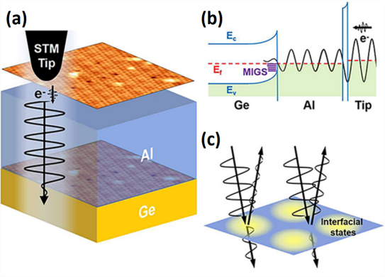 圖3 (a)STM表征鋁/鍺界面態的原理示意圖。(b)能帶示意圖與電子相干隧穿過程的示意圖。(c)界面態調制電子反射的示意圖。