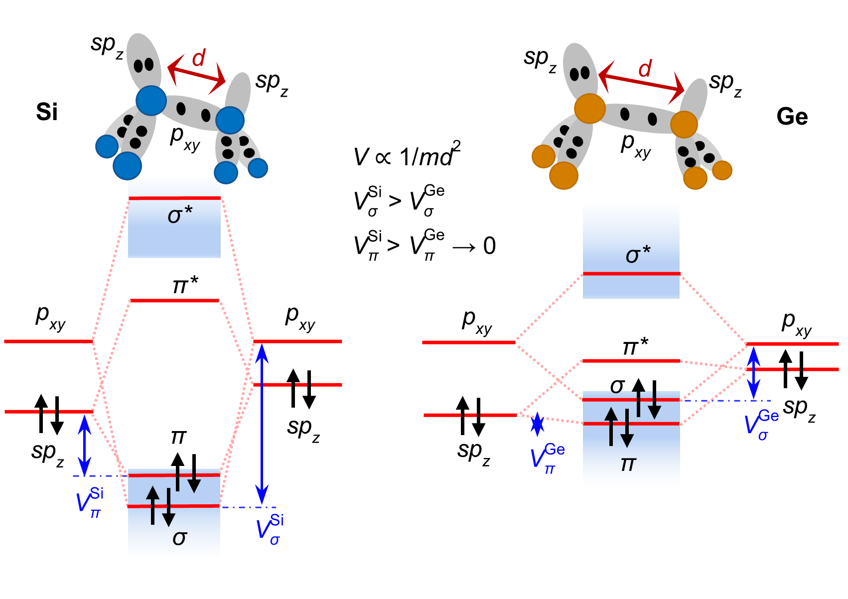 近期,中國科學院半導體研究所半導體芯片物理與技術全國重點實驗室李樹深院士和駱軍委研究員團隊使用第一性原理計算,揭示金屬-半導體接觸界面的費米能級釘扎效應存在新的物理機制。研究團隊發現,半導體懸鍵誘導的表面態對費米能級釘扎效應的貢獻至關重要,其影響甚至與金屬誘生能隙態MIGS相當。鍺擁有最強費米能級釘扎效應的關鍵在于鍺和硅傾向于形成不同的界面原子成鍵構型。半導體界面的懸鍵態在界面再構后形成新的成鍵態和反成鍵態,懸鍵上的電子完全占據新的成鍵態,從而降低系統能量,由于再構獲得的能量與鍵長平方成反比,從熱力學和動力學角度都使得硅傾向于保持穩定的自發面內成鍵構型(圖1),面內成鍵形成自鈍化效應,有效鈍化懸鍵降低了界面態密度,因此硅的費米能級釘扎效應較弱(釘扎因子S = 0.16)。而鍺的原子鍵長度比硅大4.3%,再構后獲得的能量很小,鍺傾向于保持非重構界面,直接和金屬成鍵后保留了更多的懸鍵和界面態,導致極強的費米能級釘扎效應(S = 0.02)。從鍺到硅再到金剛石,原子間距依次減小,界面懸鍵的自鈍化效應依次增強,界面懸鍵誘導表面態密度依次減小,導致費米能級釘扎效應依次降低。