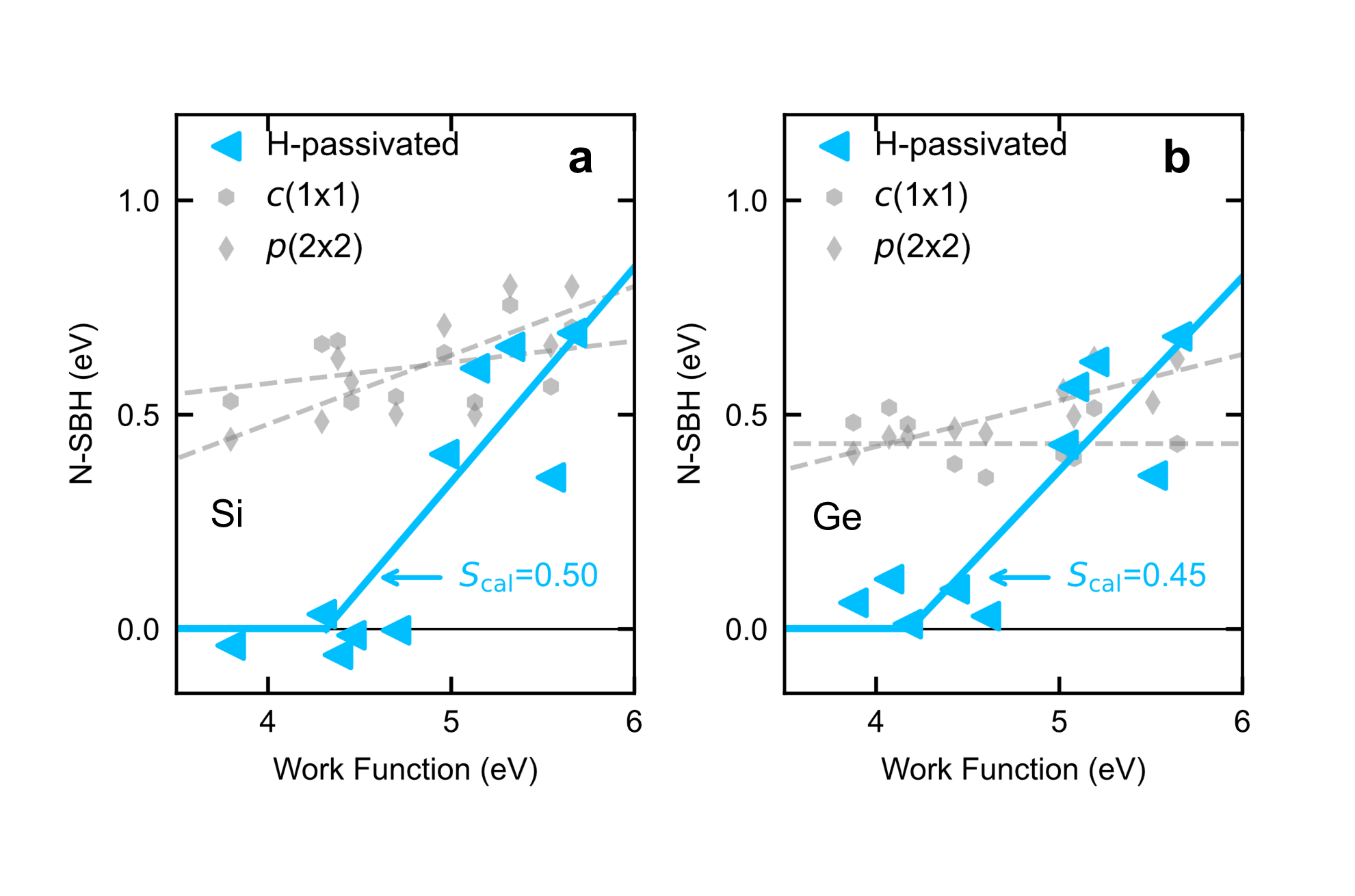 研究團隊從理論上進一步證明,可以通過引入外部非金屬原子來提高懸鍵的鈍化效果,從而大幅降低懸鍵誘導表面態密度。研究顯示使用氫原子可以完美鈍化硅和鍺界面懸鍵,達到消除所有懸鍵誘導表面態,從而大幅削弱費米能級釘扎效應,將硅和鍺的釘扎因子分別從0.16和0.02提升至?0.5和0.45(圖3),使得多種金屬可以將硅和鍺界面的肖特基勢壘降至接近理想的零值,為2nm以下工藝節點將接觸電阻率降至國際路線圖要求的10-9 ?·cm²提供了新思路。