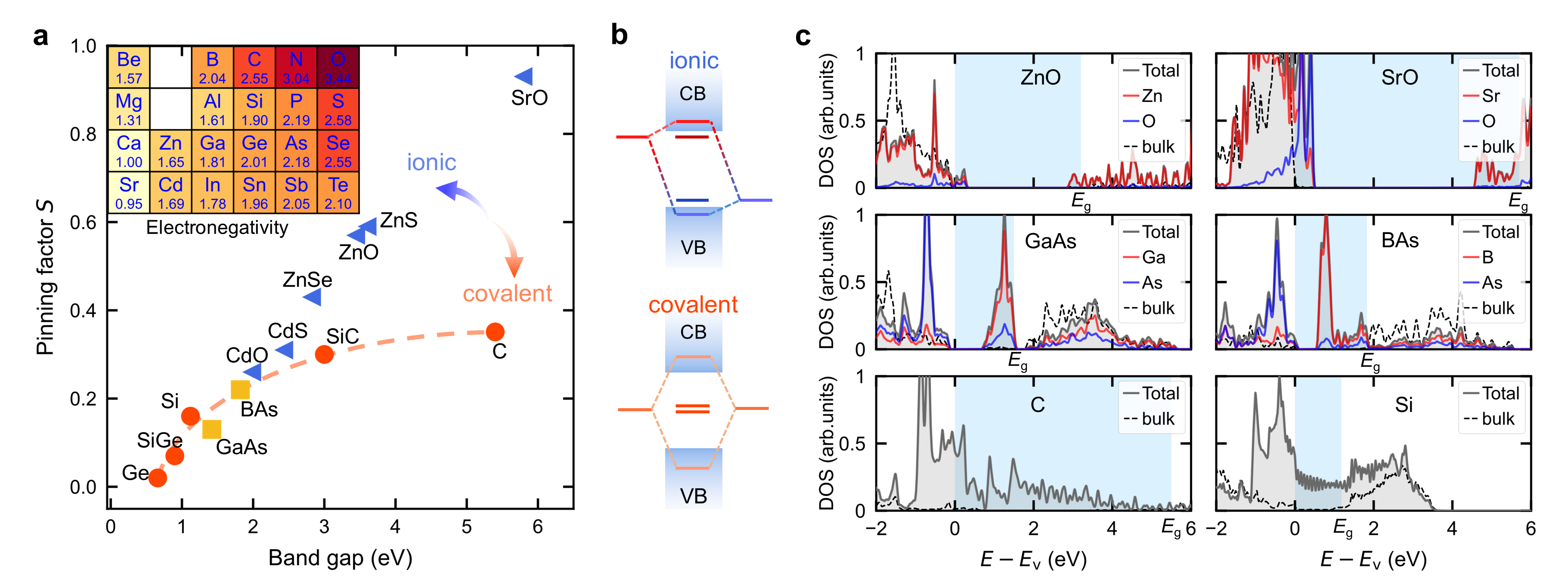 圖2:半導體離子性-懸鍵誘導表面態-費米能級釘扎強度的內在規律。隨著離子性增強,帶隙深處的懸鍵誘導表面態密度顯著降低,釘扎隨之減弱;相反,共價性更強的半導體帶隙深處的懸鍵誘導表面態密度更高,即使帶隙寬度相近,也會表現出更強的釘扎。