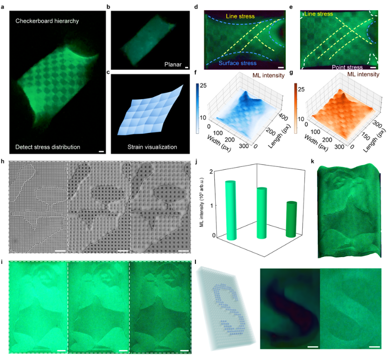 通過(guò)將應(yīng)力場(chǎng)工程與光子管理相結(jié)合,該平臺(tái)支持實(shí)時(shí)動(dòng)態(tài)應(yīng)力可視化、被動(dòng)式薄膜應(yīng)力傳感。此技術(shù)使用了光刻、壓印等工業(yè)級(jí)圖形化技術(shù),因此此項(xiàng)薄膜應(yīng)力監(jiān)測(cè)方法可擴(kuò)展到更大的監(jiān)測(cè)區(qū)域、生成更豐富的預(yù)編碼圖案庫(kù),并通過(guò)力致發(fā)光材料選擇或分層實(shí)現(xiàn)多種色彩呈現(xiàn)。該項(xiàng)技術(shù)成功將柔性薄膜和柔性結(jié)構(gòu)的內(nèi)部力學(xué)場(chǎng)轉(zhuǎn)化為像素級(jí)光學(xué)信息,并提供了一種較為通用的結(jié)構(gòu)-光學(xué)協(xié)同設(shè)計(jì)方案。
