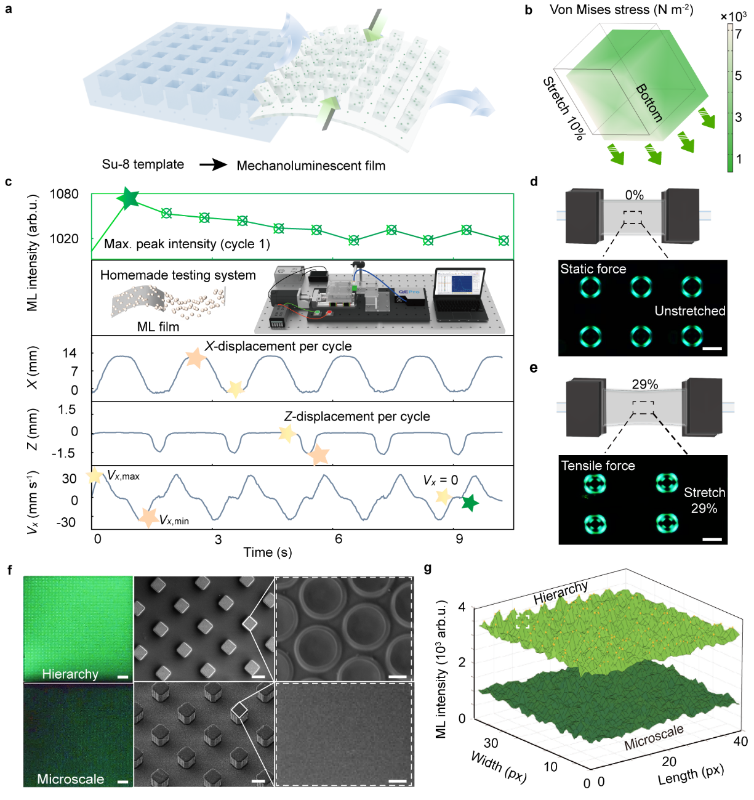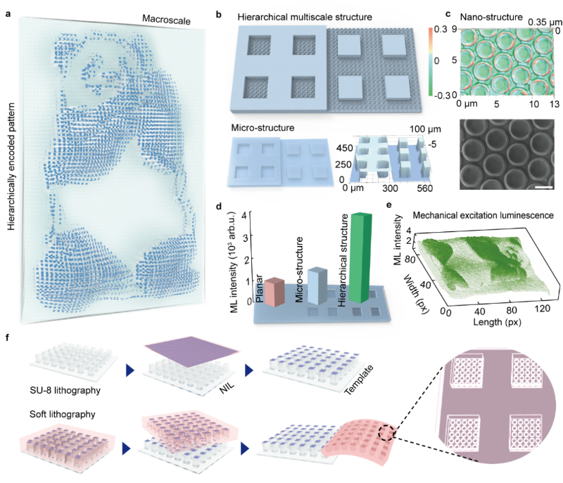 儀表網(wǎng) 研發(fā)快訊】近日,上海交通大學(xué)集成電路學(xué)院(信息與電子工程學(xué)院)微米納米加工技術(shù)全國(guó)重點(diǎn)實(shí)驗(yàn)室臧法珩副教授團(tuán)隊(duì)在柔性力學(xué)發(fā)光與可視化傳感領(lǐng)域取得新進(jìn)展。團(tuán)隊(duì)通過(guò)在機(jī)械致發(fā)光(Mechanoluminescence, ML)薄膜上構(gòu)建微米-納米多尺度層級(jí)結(jié)構(gòu),實(shí)現(xiàn)了在單片柔性薄膜上對(duì)受力信息的像素化、高分辨顯示,相關(guān)成果以 “Visually encoded mechanoluminescence through hierarchical structuring with microscale patterns and nanoscale features” (基于微納層級(jí)化結(jié)構(gòu)的視覺編碼機(jī)械發(fā)光)為題,發(fā)表在期刊《Nature Communications》上。