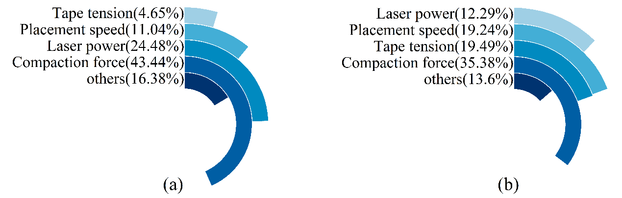 圖1 鋪層方向各因素影響大小餅狀圖:(a)正交鋪層;(b) 單向鋪層。
