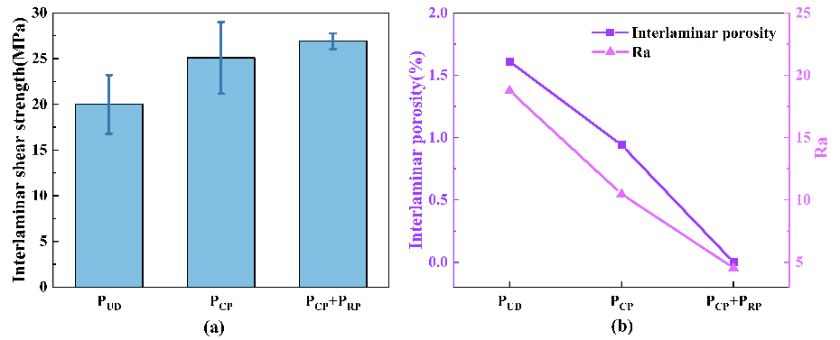 圖2 不同工藝優化方法制備的正交層合板性能:(a) ILSS;(b) Ra和層間孔隙度。
