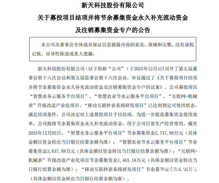 儀表網 企業動態】12月5日,新天科技(300259)公告,公司于2025年12月4日召開第五屆董事會第十六次會議和第五屆監事會第十六次會議,審議通過了《關于募投項目結項并將節余募集資金永久補充流動資金及注銷募集資金專戶的議案》。公司募投項目“智慧水務云服務平臺項目”、“智慧農業節水云服務平臺項目”、“互聯網+機械表”升級改造產業化項目、“移動互聯