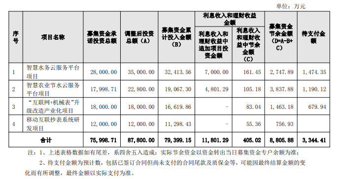 新天科技本次結項的募投項目為“智慧水務云服務平臺項目”、“智慧農業節水云服務平臺項目”、“互聯網+機械表”升級改造產業化項目、“移動互聯抄表系統研發項目”,上述項目已滿足結項條件,公司對上述募投項目予以結項,并將節余募集資金用于永久補充公司流動資金,實際節余資金以資金轉出當日募集資金專戶余額為準。本次結項的募投項目募集資金使用與節余情況如下:
