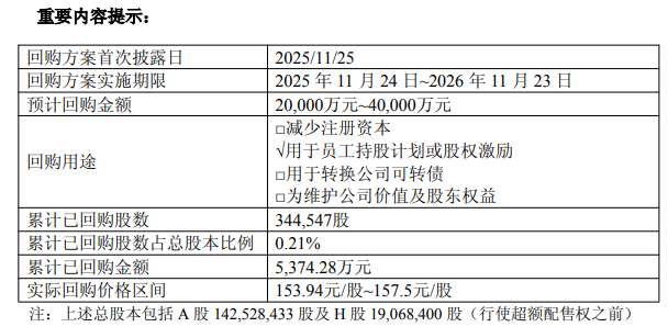 2025年12月8日,公司通過上海證券交易所系統以集中競價交易方式首次回購公司股份344,547股,占公司總股本161,596,833股(包括A股142,528,433股及H股19,068,400股(行使超額配售權之前))的比例為0.21%,回購成交的最高價為157.5元/股,最低價為153.94元/股,支付的資金總額為人民幣5,374.28萬元(不含印花稅、交易傭金等交易費用)。本次回購股份符合相關法律法規的規定及公司回購股份方案的要求。