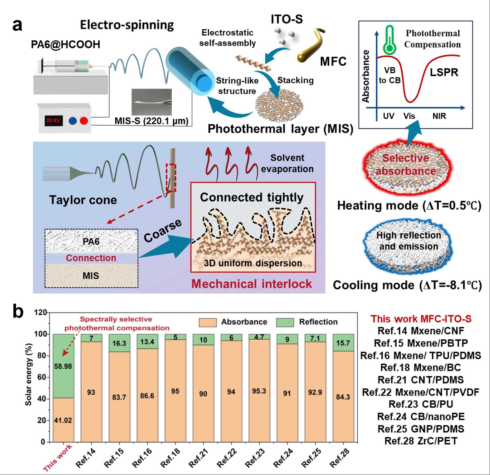 圖(a)MIS-S膜的的設計合成示意圖;(b)不同光熱材料及復合體系的太陽能利用率對比圖(A+R=100%)