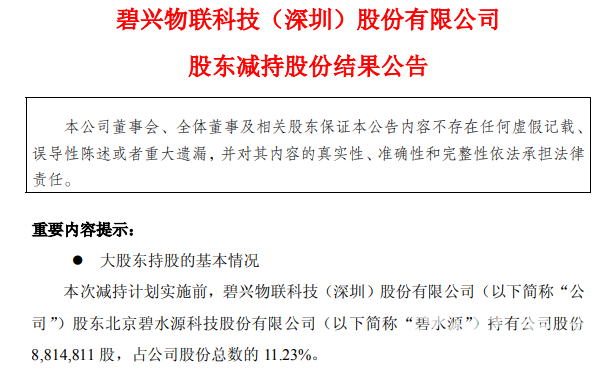 儀表網 企業動態】12月5日晚間,碧興物聯(SH 688671)發布公告稱,2025年12月5日,公司收到碧水源出具的《關于減持股份計劃實施完成的告知函》,截至本公告披露日,碧水源在2025年12月1日至2025年12月5日期間通過集中競價交易方式累計減持公司股份785,189股,占公司總股本的1%,本次減持計劃已實施完畢。
