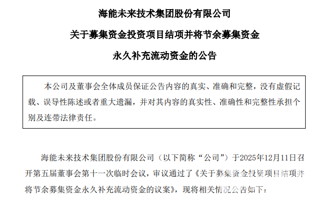 儀表網 企業動態】12月11日,海能技術(920476)披露關于募集資金投資項目結項并將節余募集資金永久補充流動資金的公告。公司于2025年12月11日召開第五屆董事會第十一次臨時會議,審議通過了《關于募集資金投資項目結項并將節余募集資金永久補充流動資金的議案》,公司募投項目“海能技術生產基地智能化升級改造項目”已達到預定可使用狀態,擬結項并將節余募集資金永久補充流動資金。