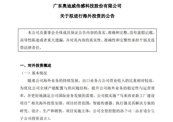 儀表網 企業動態】12月10日,奧迪威(920491)公告,隨著公司海外業務的持續發展,出口業務占公司營業收入的比重相對較高。為優化公司全球產能配置與供應鏈結構,提升公司海外業務的穩定性與運營效率,并更好地滿足公司國際業務發展的需要,公司擬實施“馬來西亞新工廠建設項目”相關海外投資安排,項目經營范圍:智能