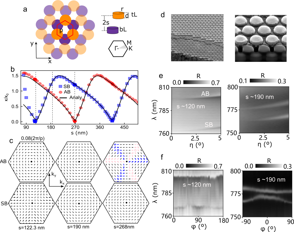 圖a 雙層氧化鈦超表面示意圖;b共振態遠場輻射相消干涉理論預測;c 不同厚度中間層超表面共振態在動量空間中遠場偏振矢量分布;d 套刻工藝加工的雙層超表面;e,f 實驗測量的角分辨反射光譜
