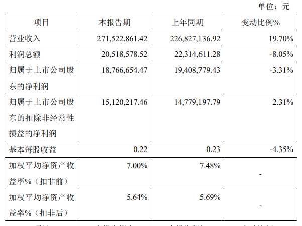 摘要報(bào)告期內(nèi)公司實(shí)現(xiàn)營業(yè)收入2.72億元,同比增長19.70%;歸屬于上市公司股東的凈利潤1876.67萬元,同比減少3.31%;基本每股收益0.22元,同比減少4.35%。