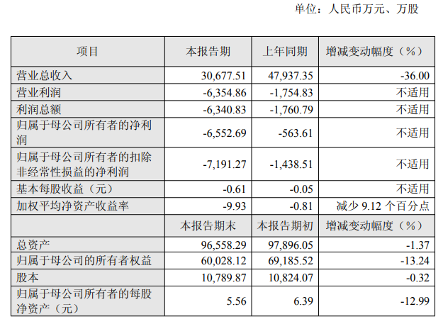 報告期末,公司總資產96,558.29萬元,與報告期初相比下降1.37%;歸屬于母公司的所有者權益60,028.12萬元,與報告期初相比下降13.24%;歸屬于母公司所有者的每股凈資產5.56元,與報告期初相比下降12.99%。