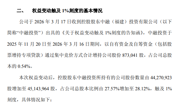 本次增持完成后,中融投資持股數量由4427萬股增至4514萬股,持股比例從27.57%提升至28.12%,成功觸及1%權益變動刻度,且公司控股股東及實際控制人未發生變更,不觸及要約收購義務。