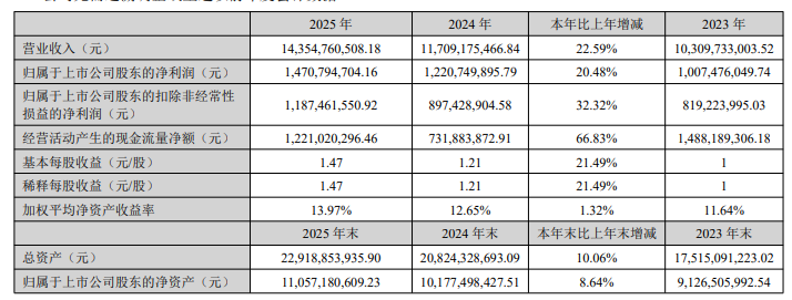 年報核心數據顯示,2025年公司經營成果亮眼,核心指標均實現兩位數增長。報告期內,公司實現營業收入143.55億元,同比增長22.59%,營收規模創下歷史新高;歸屬母公司凈利潤14.71億元,同比增長20.48%,盈利能力保持穩健;扣非歸母凈利潤11.87億元,同比增幅達32.32%,顯著高于歸母凈利潤增速,體現出核心主業盈利能力的大幅躍升,業績含金量持續提升。與此同時,公司盈利質量同步改善,全年經營活動現金流凈額達12.21億元,同比增長66.83%。