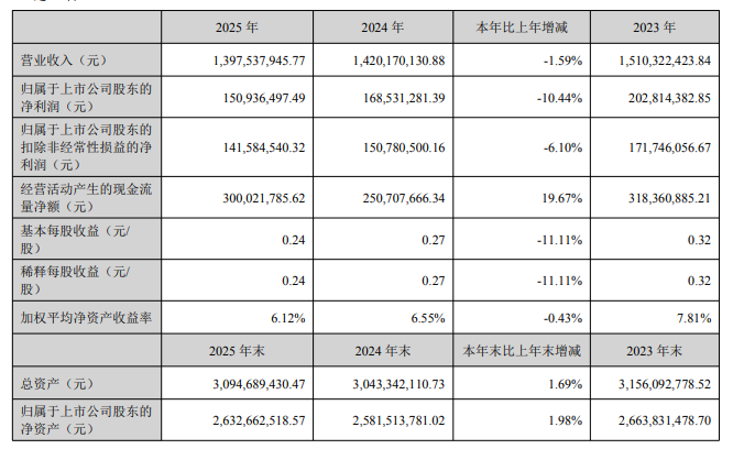股東回報方面,公司始終堅持積極的利潤分配政策,擬向全體股東每10股派發(fā)現(xiàn)金紅利2.00元(含稅)。以公司現(xiàn)有總股本635,760,924股為基數(shù)測算,預計2025年度現(xiàn)金分紅總額為1.27億元,占本年度歸屬于母公司股東凈利潤的比例高達84.24%,遠超公司章程中“每年以現(xiàn)金方式分配的利潤不少于當年可分配利潤的20%”的要求,充分體現(xiàn)了公司對股東的重視與回報意愿。
