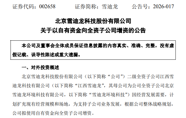 雪迪龍本次向子公司增資,既是對下屬主體業務發展的有力支撐,也是公司深耕環境綜合服務領域、拓展區域市場的重要布局。江西雪迪龍作為公司在華東區域的重要布局,此次增資后將進一步擴充經營規模、完善場地設施,提升環境管家項目的實施能力,助力公司搶占區域環保服務市場份額;而雪迪龍環境科技資本實力的增強,將進一步強化其對下屬子公司的管控與支撐能力,推動公司整體業務協同發展。?