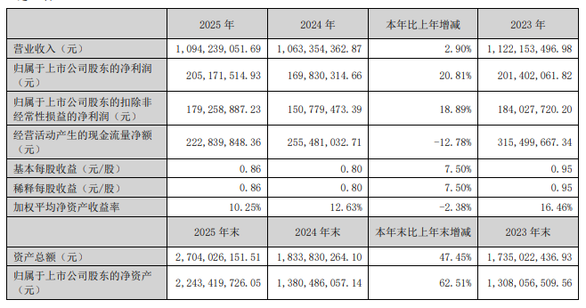 儀表網(wǎng) 行業(yè)財報】3月27日,安科瑞(300286.SZ)發(fā)布2025年年度報告,公司營業(yè)收入為10.94億元,同比增長2.90%。歸屬于上市公司股東的凈利潤為2.05億元,同比增長20.81%。歸屬于上市公司股東的扣除非經(jīng)常性損益的凈利潤為1.79億元,同比增長18.89%?;久抗墒找鏋?.86元。此外,擬向全體股東每10股派發(fā)現(xiàn)金紅利3.5元(含稅),合計派現(xiàn)約8777.46萬元。