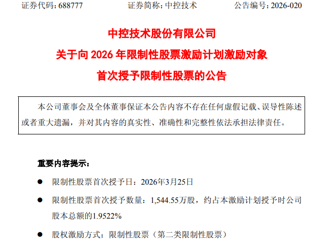 儀表網 企業動態】3月25日,中控技術(688777)正式發布公告,披露公司2026年限制性股票激勵計劃首次授予相關事宜。公告顯示,公司于當日召開第六屆董事會第十八次會議,審議并全票通過了《關于向2026年限制性股票激勵計劃激勵對象首次授予限制性股票的議案》,根據2026年第一次臨時股東會的明確授權,董事會確定了本次激勵計劃的首次授予關鍵細節,進一步完善公司長期激勵機制,綁定核心人才與企業發展命運。