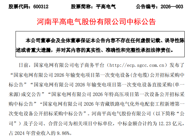 值得注意的是,平高電氣在公告中也提示了相關風險:目前公司尚未與國家電網相關機構簽署正式商務合同,合同條款存在不確定性;中標項目的交貨時間需根據實際合同要求確定,對公司當期業績的影響存在不確定性,具體內容以最終簽署的合同為準,敬請廣大投資者謹慎決策,注意投資風險。?