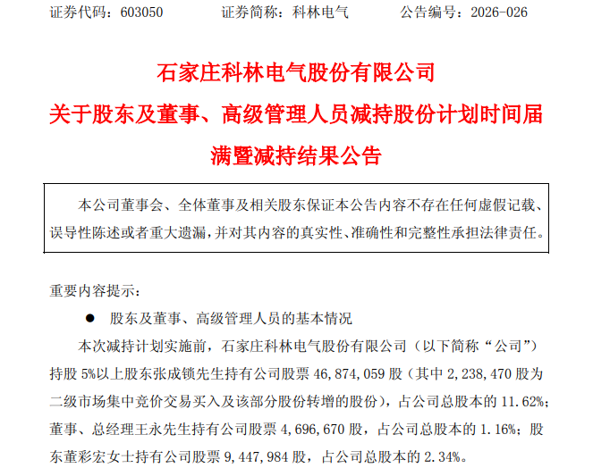 儀表網(wǎng) 企業(yè)動(dòng)態(tài)】3月30日,科林電氣(603050)發(fā)布公告,披露公司股東張成鎖、王永、董彩宏此前披露的減持計(jì)劃已如期屆滿。根據(jù)公告細(xì)節(jié),三位股東在減持區(qū)間內(nèi)完成了部分減持操作,合計(jì)減持股份占公司總股本的3.49%,未達(dá)到此前披露的合計(jì)不超過(guò)3.55%的減持計(jì)劃上限。