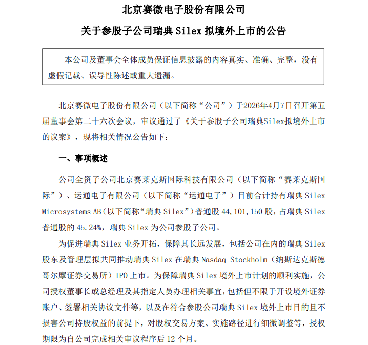 此次推動瑞典Silex境外上市,是賽微電子聯合瑞典Silex其他股東及管理層共同作出的戰略決策,得到了賽微電子董事會的正式審議通過。為保障上市計劃順利推進,賽微電子已授權董事長或總經理及其指定人員,負責辦理開設境外證券賬戶、簽署相關協議文件等具體事宜,授權有效期為自公司完成相關審議程序后12個月。公告明確,該事項不構成關聯交易,亦不涉及重大資產重組,無需提交公司股東大會審議。?