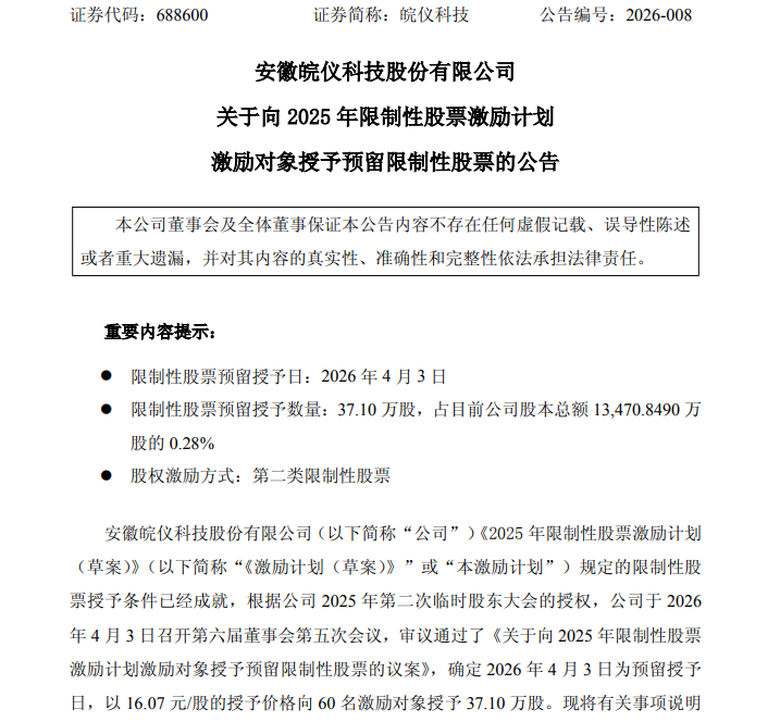 儀表網(wǎng) 企業(yè)動(dòng)態(tài)】4月4日,皖儀科技(688600)發(fā)布《關(guān)于向2025年限制性股票激勵(lì)計(jì)劃激勵(lì)對(duì)象授予預(yù)留限制性股票的公告》,明確公司已于2026年4月3日完成預(yù)留限制性股票的授予工作,進(jìn)一步完善長(zhǎng)效激勵(lì)機(jī)制,綁定核心人才與公司長(zhǎng)遠(yuǎn)發(fā)展利益,彰顯企業(yè)持續(xù)發(fā)展的信心與決心。?