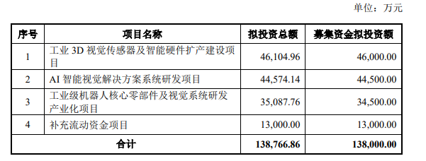 工業(yè)3D視覺傳感器及智能硬件擴產(chǎn)建設項目(4.6 億元): 主要用于擴充3D視覺