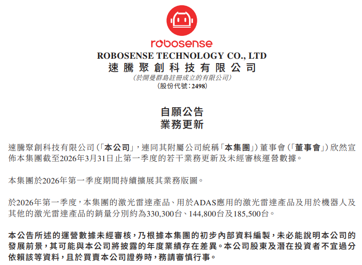 儀表網 企業動態】4月8日晚間,速騰聚創(02498.HK)披露2026年第一季度未經審核運營數據,交出一份遠超市場預期的亮眼成績單。報告期內,公司憑借 “ADAS + 機器人” 雙輪驅動戰略的深度落地,實現