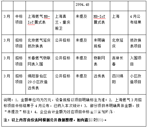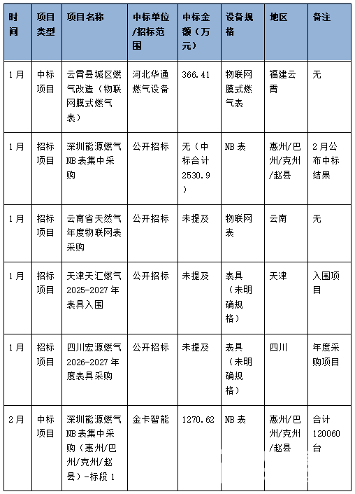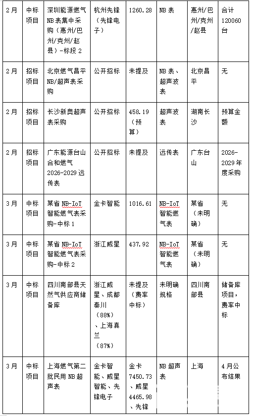 從時間分布來看,招投標活動呈現“均衡分布、3月發力”的特點:1月以招標啟動為主,共發布4個招標項目,聚焦年度集中采購與區域改造需求,僅1個中標項目落地;2月中標項目集中釋放,深圳能源NB表集中采購等重點項目公布結果,同時發布3個招標項目,延續市場熱度;3月成為招投標高峰,不僅有5個中標項目落地(含上海燃氣第二批民用表采購等大額項目),還發布5個招標項目,涵蓋技改換表、物聯網表入圍等多元需求,為后續市場奠定基礎。