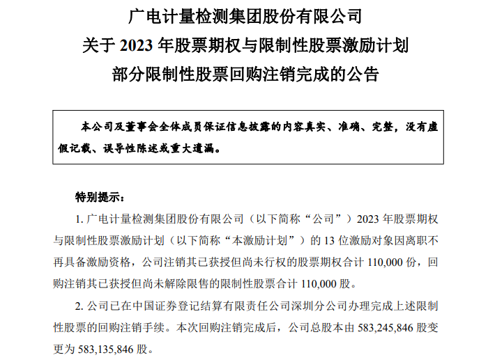 儀表網 企業動態】12月4日,廣電計量(002967)發布公告稱,公司已完成2023年股票期權與限制性股票激勵計劃中部分限制性股票的回購注銷手續。此次回購注銷涉及13位因離職失去激勵資格的對象,合計注銷限制性股票11萬股,公司總股本由此前的583,245,846股變更為583,135,846股。