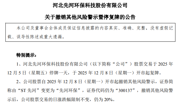 儀表網 企業動態】12月4日,ST先河(300137.SZ)公告稱,公司股票交易于2025年12月5日(星期五)停牌一天,于2025年12月8日(星期一)開市起復牌。公司股票自2025年12月8日(星期一)開市起撤銷其他風險警示,證券簡稱由“ST先河”變更為“先河環保”,證券代碼仍為“300137”,撤銷其他風險警示后,公司股票交易的日漲跌幅限制不變,仍為20%。