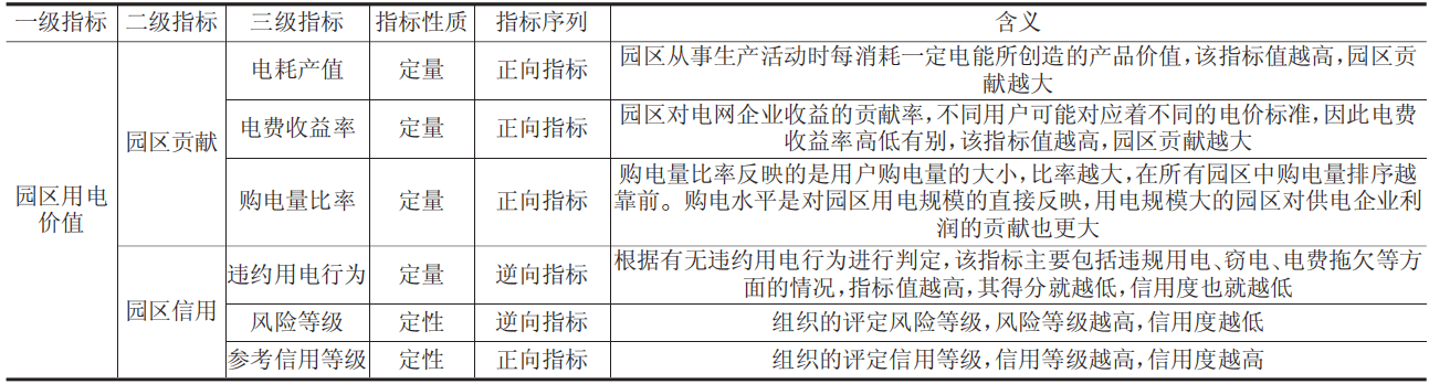 2)園區信用。由于電能的生產和消費具有同時性,電能交易只能實時計量、事后結算,其營銷方式屬于賒銷,部分用戶會惡意拖欠、逃避電費或竊取電量,風險較大,給電力企業的正常經營造成惡劣影響,電力企業在保證自身服務質量的同時,學會如何規避這一風險。例如,將園區的用電信用與缺電時期對其的供電質量掛鉤,園區的用電信用越差,作為懲罰,在電力保供工作中對這類園區先行限電。此外,園區自身的風險等級和參考信用等級也是園區信用的重要組成部分。園區用電價值評價指標如表1所示。