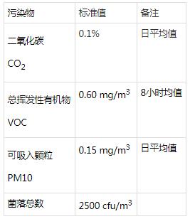 下表為中華人民共和國標準《GBT18883-2002 室內空氣質量標準》對室內空氣所設定的標準值:
