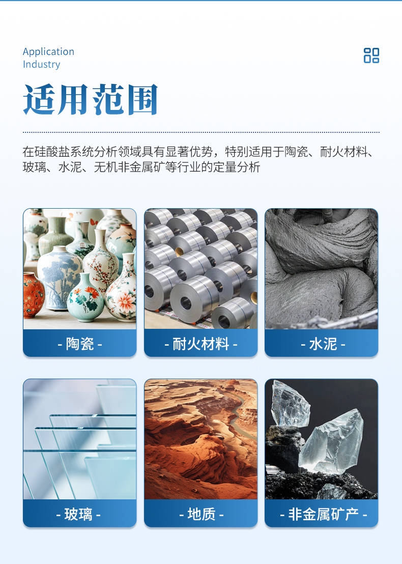 硅酸鹽行業(yè):陶瓷、玻璃、水泥、耐火材料等原料及成品分析。