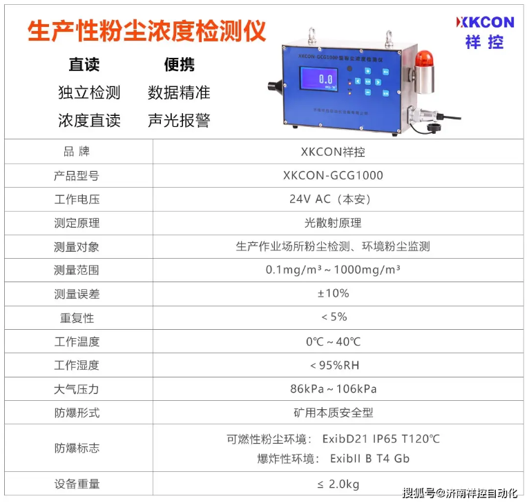 濟南祥控自動化設備有限公司生產的工業粉塵濃度檢測儀XKCON-GCG1000主要用于工業場所對環境中的生產性粉塵濃度進行測定,此款粉塵檢測儀符合MT163-1997《直讀式粉塵濃度測量儀表通用技術條件》、GB3836-2010 防爆要求,符合Q/XK 001-2022《XKCON-GCG1000粉塵濃度檢測儀》企業標準,適用于環保、各類工業生產場所、煤礦及其它有爆炸危險性的作業環境中對粉塵濃度進行精準監測。