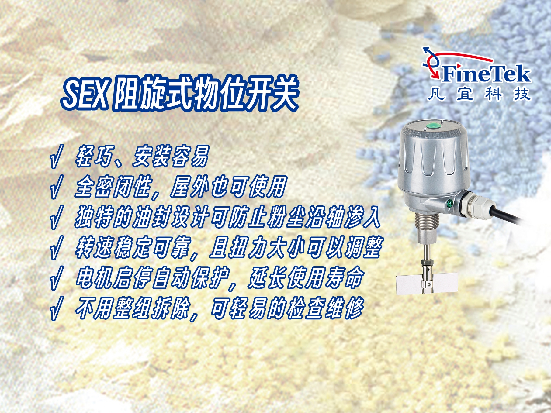 SEX 阻旋式物位開關之葉片是利用傳動軸與離合器相接,在未接觸物料時,電機保持正常的運轉,當葉片接觸物料后,電機會停止轉動,結構同時輸出一接點信號而測出料位高度。